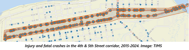 Over the last decade on 4th & 5th Streets, 5 people were killed and 35 seriously injured while walking, biking, or rolling. Over the same period, 1 motorist was killed and 31 seriously injured.
